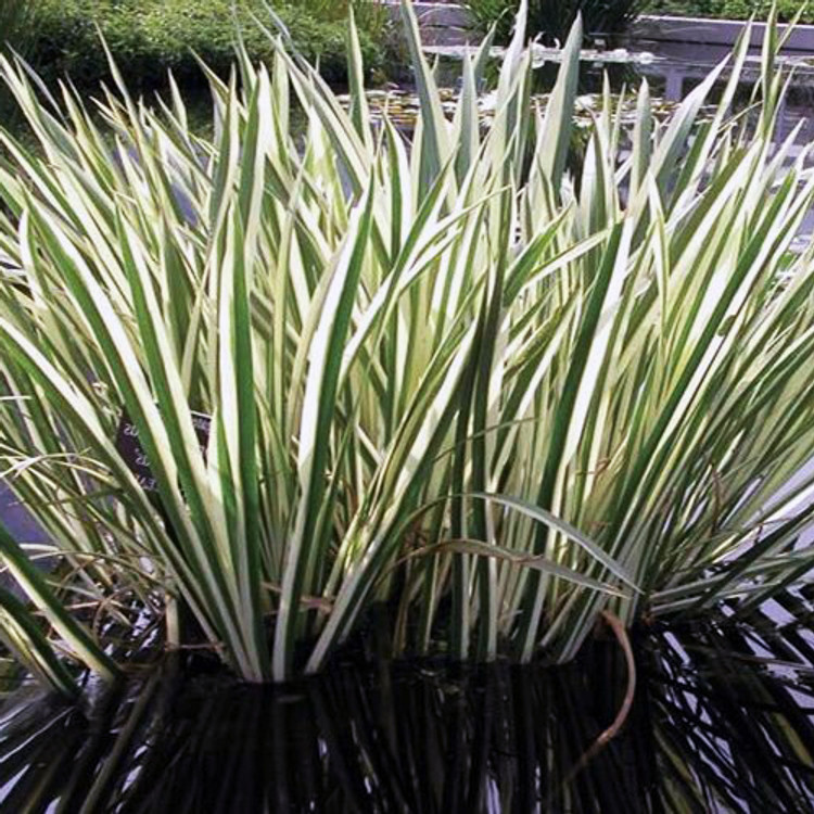 A. g. ‘Variegatus’ is commonly called variegated Japanese rush, dwarf sweet flag or grassy-leaved sweet flag. It is a semi-evergreen, marginal aquatic perennial that features grass- to iris-like tufts of narrow, variegated leaf blades (1/4″ wide) which are striped with white and green and fan upward to 6-12″ tall. It thrives in wet soils and is commonly grown in water gardens and boggy areas as a foliage accent or ground cover. Although it looks like a grass or small iris, it is actually a member of the acorus family. Insignificant, sedge-like flower spikes (2-3″ long spadixes without showy spathes) are densely packed with tiny greenish flowers that bloom from late spring to early summer. Flowers give way to tiny fleshy berries. Tufts slowly spread by creeping roots to form a dense ground cover. Foliage is sweetly fragrant when bruised.