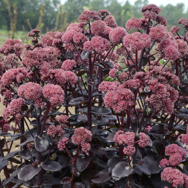 This late season bloomer can be admired for its strictly upright habit of dark black-purple, semi-glossy succulent leaves. Small clusters of light mauve pink flowers are produced on deep red stems, the perfect accent color to the darkly colored foliage. Flowers are produced on the top half of this tall Stonecrop, with no lodging. With a narrow base and a vase-like habit, this perennial combines well with shorter companions in a limited space.